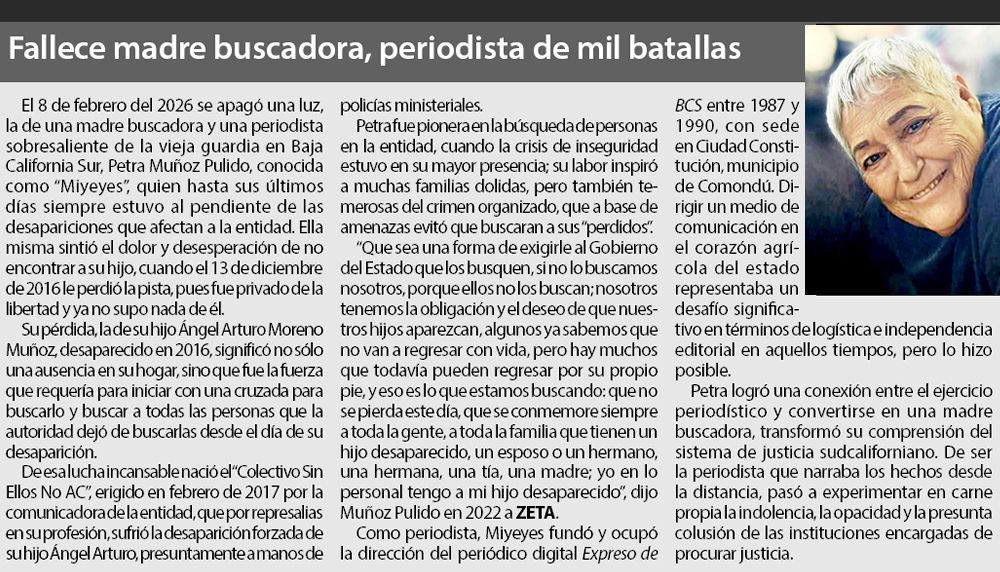 “¿Dónde queda la debida diligencia, el enfoque humanitario y la participación conjunta que establece la Ley General en Materia de Desaparición Forzada de Personas, Desaparición Cometida por Particulares y del Sistema Nacional de Búsqueda de Personas? ¿Y la participación de familiares, y el derecho humano a la verdad? No se respeta la Convención Internacional para la protección de todas las personas contra las desapariciones forzadas. Por sí no tenían el dato (que no me sorprende): La Ley General en Materia de Desaparición Forzada, obliga a las autoridades (fiscalías y Comisiones de Búsqueda) a mantener actualizado el Registro Nacional de Fosas Comunes y de Fosas Clandestinas y el Registro Nacional de Personas Desaparecidas y No Localizadas (RNPDNO), permitiendo a las familias consultar estos registros”, finalizó el colectivo Búsqueda X La Paz.