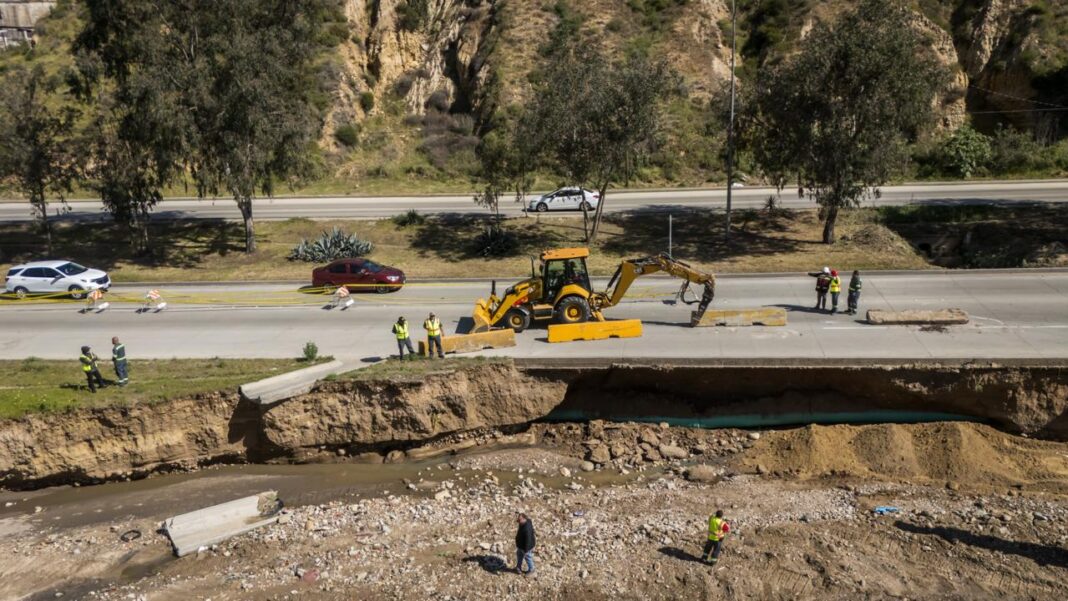 Trabajos de reparación se realizan en el carril de acotamiento del Libramiento Rosas Magallón Sur, a la altura del Puente Amarillo, tras las lluvias recientes que generaron escurrimientos en el arroyo cercano y provocaron el desplazamiento de material de relleno, informó la Comisión Estatal de Servicios Públicos de Tijuana (CESPT).