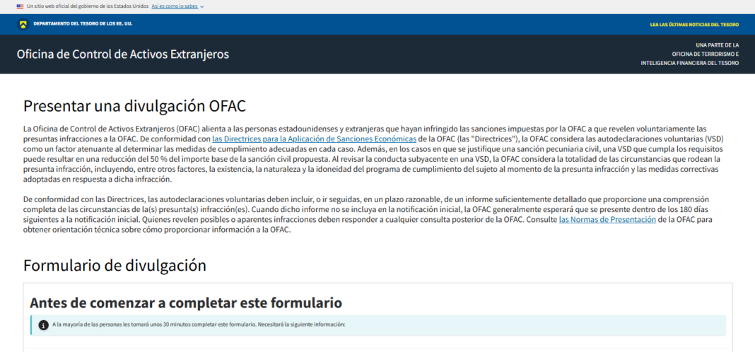 El Departamento del Tesoro de Estados Unidos, a través de la Oficina de Control de Activos Extranjeros (OFAC, por sus siglas en inglés), puso en operación ,el 6 de febrero de 2026, un nuevo Portal de Autodivulgación Voluntaria en línea para la presentación de reportes relacionados con posibles infracciones a sus programas de sanciones. La herramienta digital busca ofrecer un mecanismo simplificado y seguro para que personas y entidades de Estados Unidos y de otros países remitan información sobre aparentes violaciones al régimen de sanciones económicas administrado por la autoridad estadounidense.
