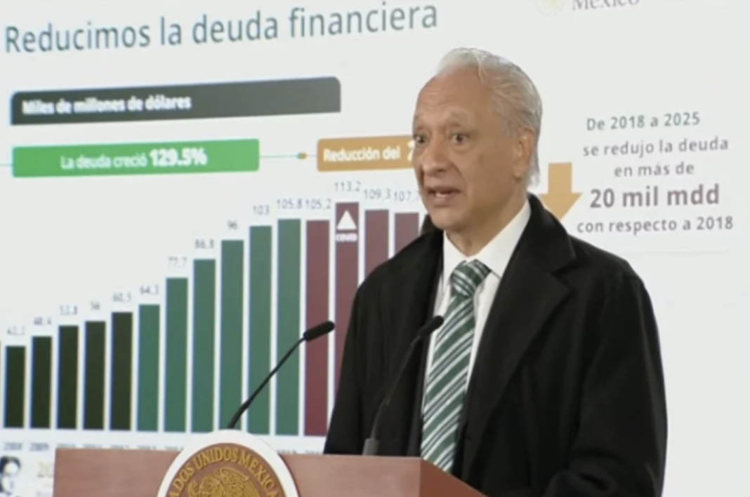 El titular de la petrolera indicó que la Secretaría de Hacienda y Crédito Público (SHCP) reportó que, al cierre de 2025, la deuda financiera disminuyó en 10 mil millones de dólares, con lo cual la reducción acumulada frente al nivel observado en 2018 asciende a 23 mil millones de dólares.