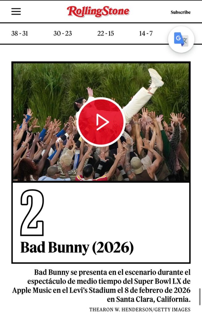 En paralelo, la repercusión del espectáculo también se reflejó en plataformas digitales. Durante las primeras horas de hoy, seis canciones de Bad Bunny se posicionaron dentro del Top 50 de Spotify en Estados Unidos, entre ellas “DMF” en el primer lugar, “BAILE INOLVIDABLE”, “NUEVAYoL.”, “EoO”, “VOY A LLEVARTE PA PR” y “Tití Me Preguntó”, mismos temas que formaron parte del repertorio interpretado durante su presentación en San Francisco.