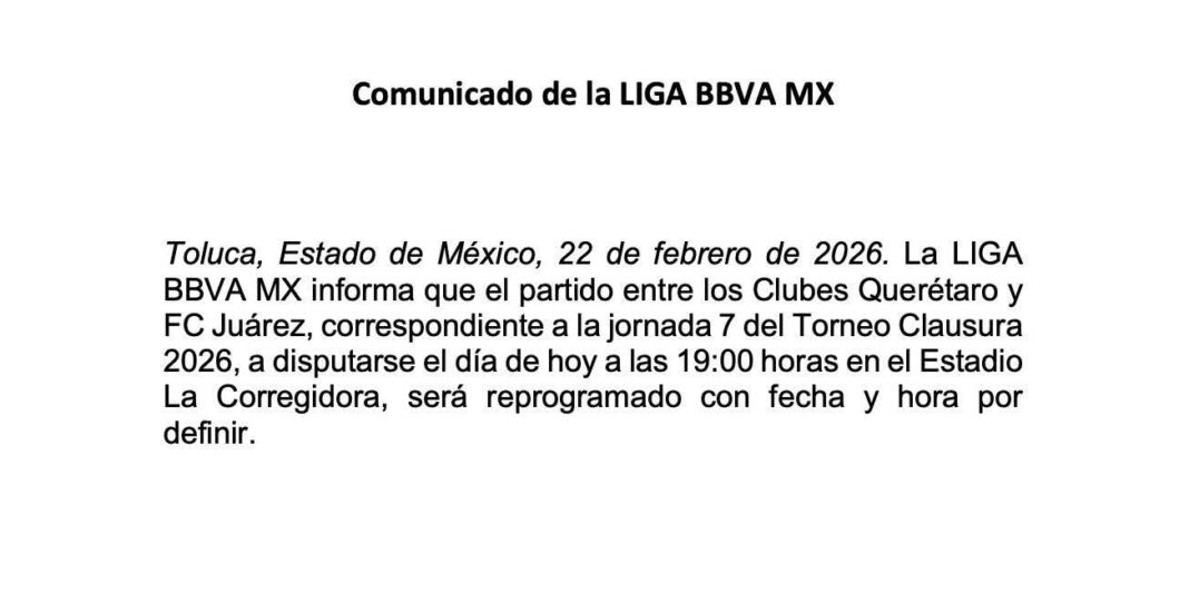En la Liga MX, el duelo entre Querétaro y Juárez, correspondiente a la jornada 7 del torneo Clausura 2026, que se jugaría este domingo en el Estadio Corregidora no se jugará.