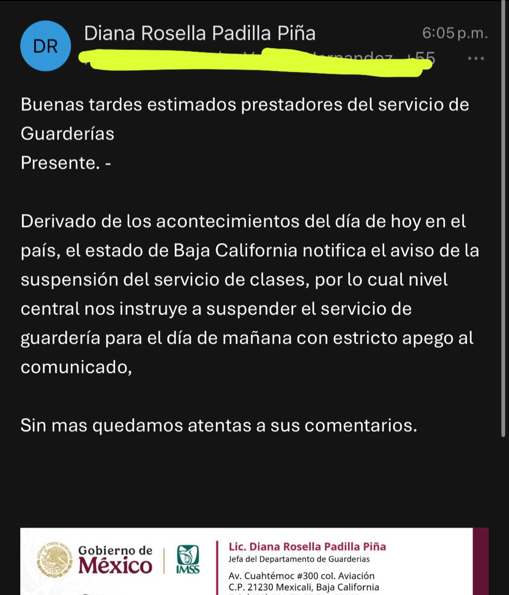 Por otra parte, el Instituto Mexicano del seguro social a través de un comunicado girado a las diferentes guarderías del municipio de Tecate, ha informado la suspensión del servicio para este lunes 23 de febrero, por lo que no se estarán recibiendo niños o niñas que asistan.