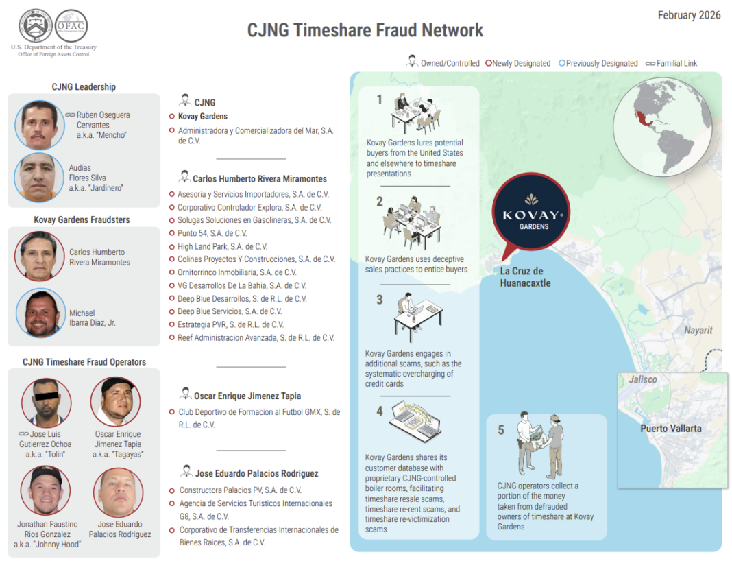 El Departamento del Tesoro de Estados Unidos (DOT, por sus siglas en inglés) sancionó el 19 de febrero de 2026 una red de fraude de tiempo compartido controlada por el Cártel de Jalisco Nueva Generación (CJNG), que incluye el resort Kovay Gardens, cinco personas físicas y 17 empresas mexicanas. La mayoría de los involucrados operan en Puerto Vallarta, Jalisco, o en sus alrededores.