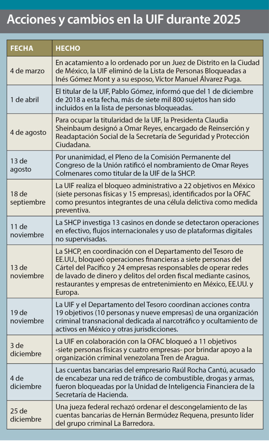 Prueba de ello es que durante 2024 la UIF de Gómez emitió 22 acuerdos de bloqueo e incluyó a 316 sujetos en la Lista de Personas Bloqueadas (LPB), mientras que en 2025, tras el cambio de titular en agosto, y el arribo de Reyes, la institución dependiente de la Secretaría de Hacienda y Crédito Público (SHCP) concluyó el año con 78 acuerdos de esa naturaleza para congelar las cuentas bancarias de personas sospechosas de infiltrar el sistema financiero con dinero producto de operaciones con recursos de procedencia ilícita, aunque en el informe anual no se reveló la cantidad de sujetos.