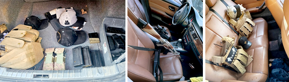En los asientos traseros fueron localizados tres chalecos antibalas con la leyenda “F.E.R” y logotipos de una calavera con sombrero, además de múltiples cargadores metálicos y de plástico con municiones de distintos calibres, incluidos cartuchos 7.62.