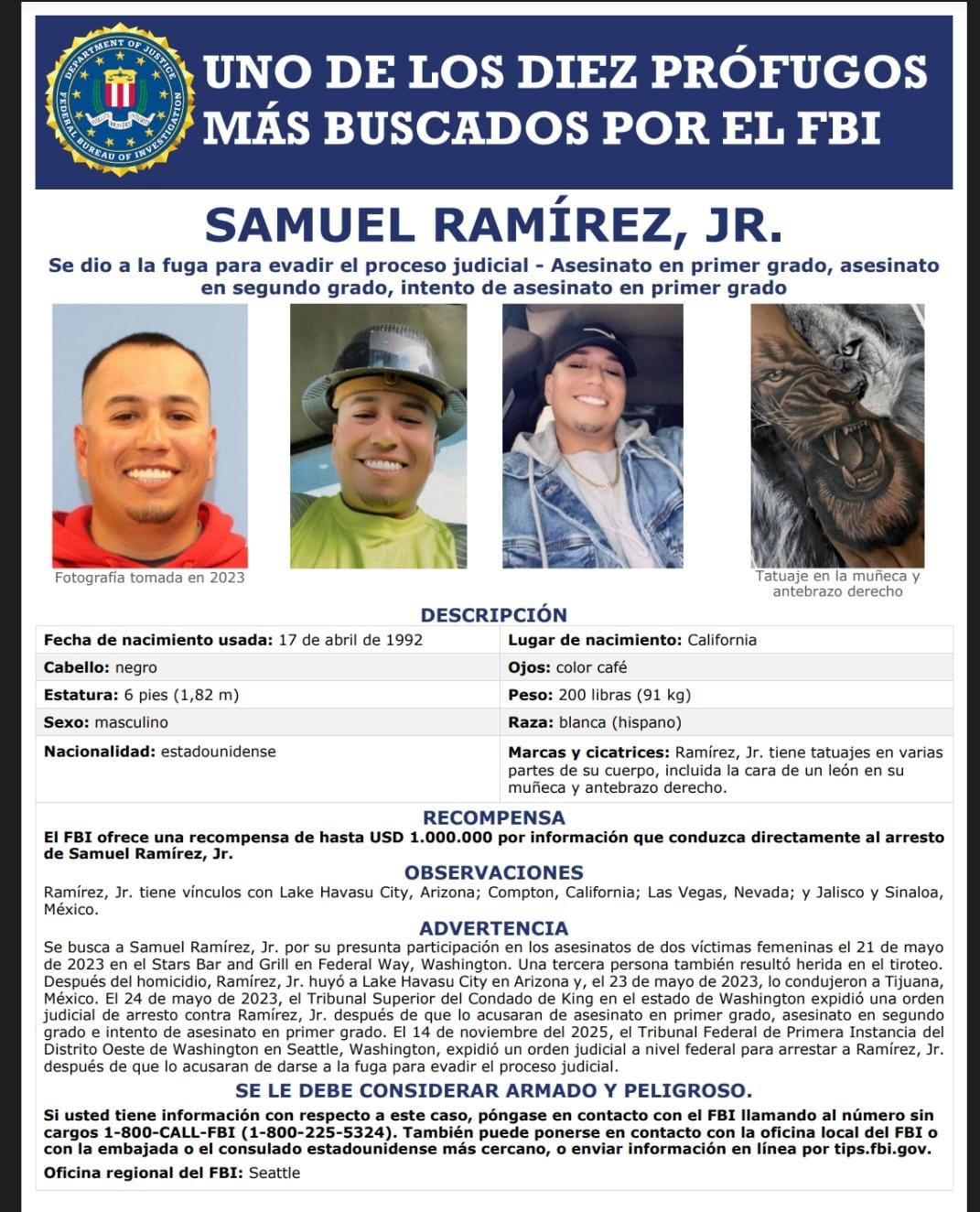 Samuel Ramírez Cruz Jr., acusado de un tiroteo en un bar de Washington donde murieron dos mujeres, fue incluido en la lista de los 10 fugitivos más buscados; ofrecen hasta un millón de dólares por información sobre su paradero.