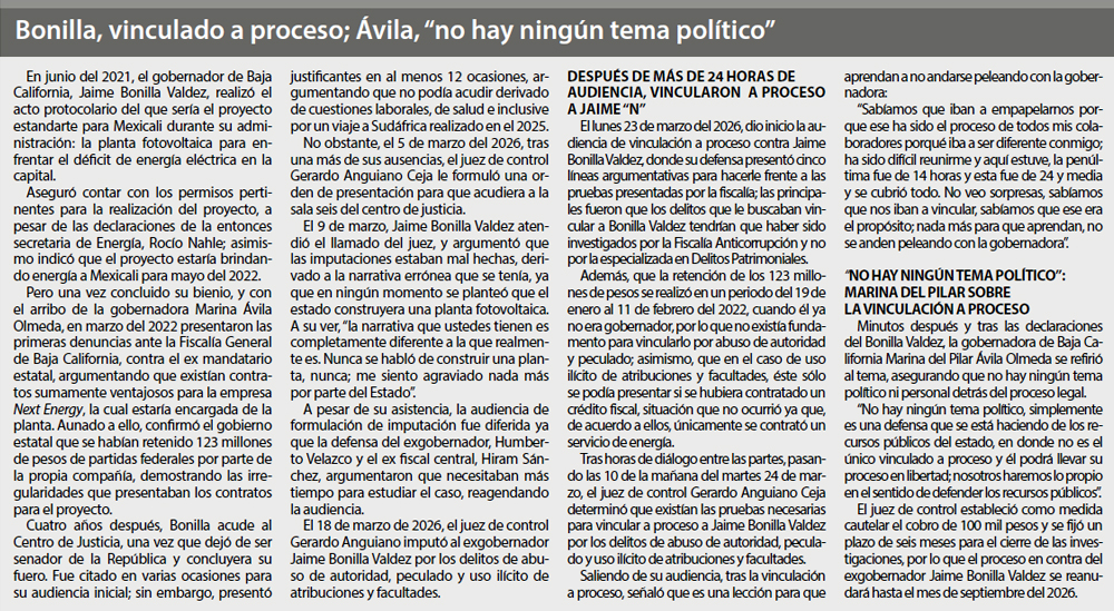 Justifica el exgobernador sobre su caso: “Creemos que no tienen bases; lo de la fotovoltaica es muy claro, es un proyecto que se frustró porque ella lo paró. No porque no conviniera; convenía y se necesitaba. Pero como dejó de ser negocio para su marido y querían ellos seguir comprando energía en lugar de generarla y que la planta fuera del Estado, que esa era mi tirada. Por eso fue el interés, incluso hay un video donde ella está en la inauguración y le echa porras al proyecto. Es más, a esa inauguración no la invitamos. Ella fue. Y aquí estaba ahí, corrimos la atención, inclusive quiso hablar y dio un discurso muy positivo; y de repente ya era gobernadora electa, alguien le habla al oído y le dice: ‘Oye, no, como el negocio este es comprar la energía, o sea, ahí nos llevamos el moche’. Es tan sencillo como eso”.