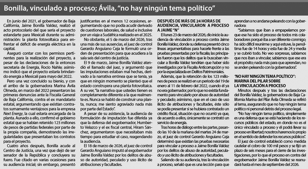Justifica el exgobernador sobre su caso: “Creemos que no tienen bases; lo de la fotovoltaica es muy claro, es un proyecto que se frustró porque ella lo paró. No porque no conviniera; convenía y se necesitaba. Pero como dejó de ser negocio para su marido y querían ellos seguir comprando energía en lugar de generarla y que la planta fuera del Estado, que esa era mi tirada. Por eso fue el interés, incluso hay un video donde ella está en la inauguración y le echa porras al proyecto. Es más, a esa inauguración no la invitamos. Ella fue. Y aquí estaba ahí, corrimos la atención, inclusive quiso hablar y dio un discurso muy positivo; y de repente ya era gobernadora electa, alguien le habla al oído y le dice: ‘Oye, no, como el negocio este es comprar la energía, o sea, ahí nos llevamos el moche’. Es tan sencillo como eso”.