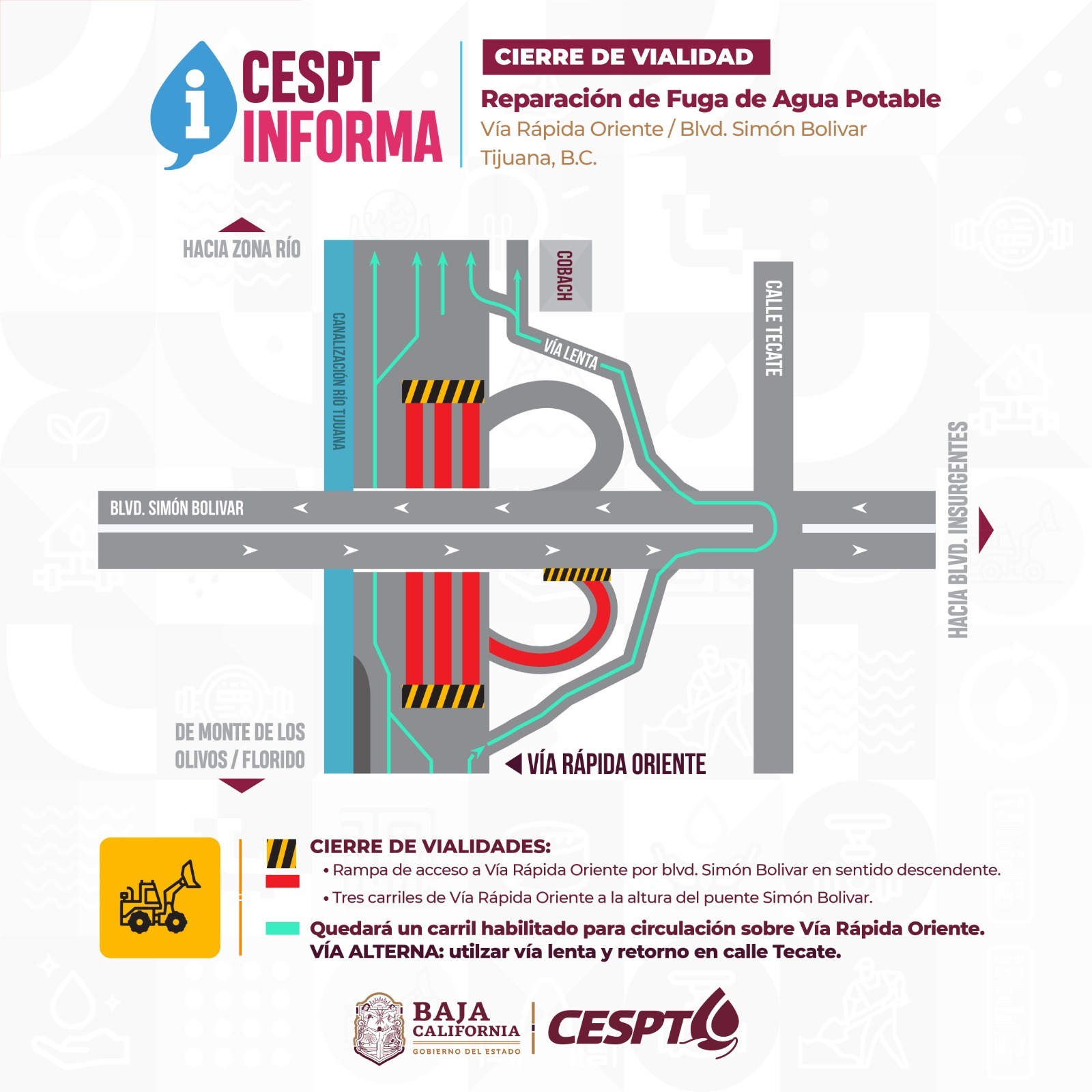 La Comisión Estatal de Servicios Públicos de Tijuana (CESPT) informó que realizará trabajos de reparación en una tubería de agua potable ubicada en los carriles centrales de la Vía Rápida Oriente, a la altura del puente Simón Bolívar, frente al fraccionamiento Alba Roja.