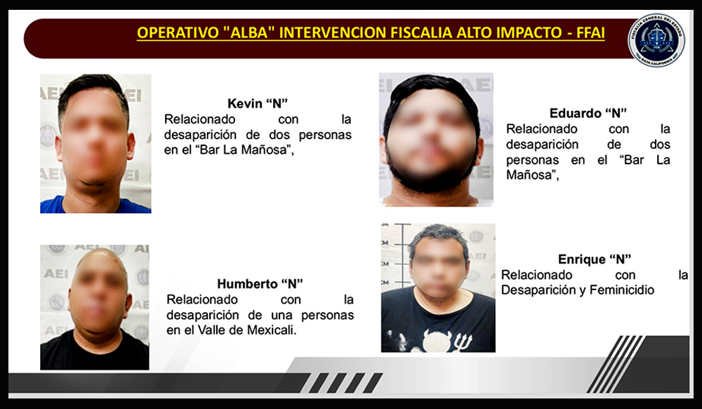 En un operativo simultáneo en diversas partes de Mexicali y el Valle, elementos de la Agencia Estatal de Investigación (AEI) capturaron a cuatro elementos de la Policía Municipal activos, señalados por presuntamente participar en delitos de desaparición forzada y feminicidio, y, al menos tres, son vinculados con el grupo delictivo de los Rusos.