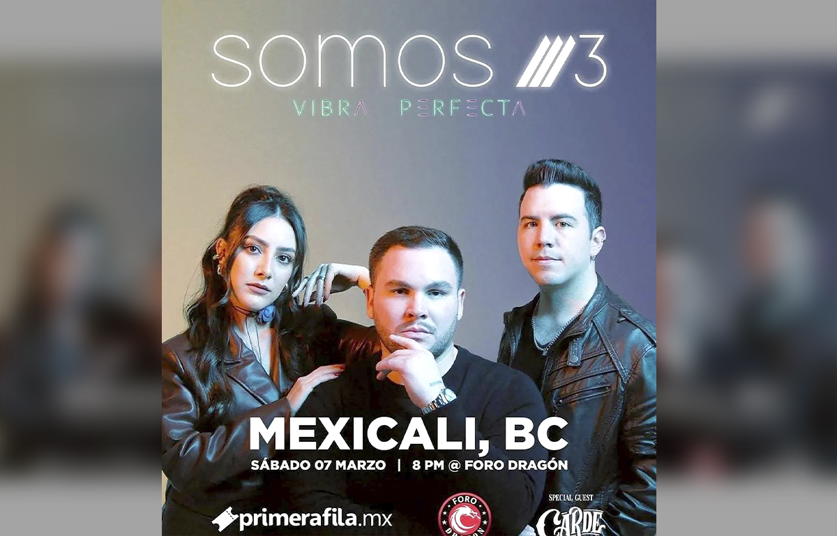 Formado en 2016 por Isamar Salgueido, Yannick Aguirre y Alonso Wilhelmy, el trío de música pop nativo de la capital bajacaliforniana estará presentando su más reciente material discográfico “Vibra Perfecta”. En su joven carrera, Somos 3 ha logrado éxito teniendo colaboraciones con artistas como Julión Álvarez.