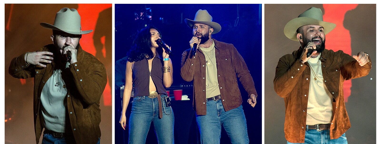 Acompañado de sus músicos, el intérprete subió al templete con un outfit que ya lo caracteriza: pantalón de mezclilla, chamarra café y su sombrero colocado a su estilo.