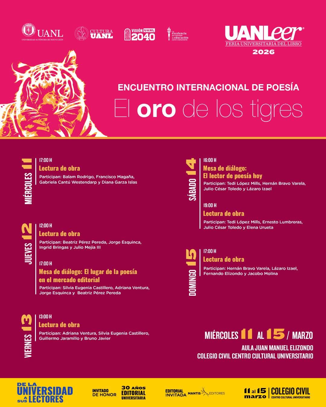 Asimismo, este año, la UANLeer presenta el III Encuentro Internacional de Poesía “El oro de los Tigres” con la participación de más de 20 poetas con lectura de obra y mesas de diálogo.
