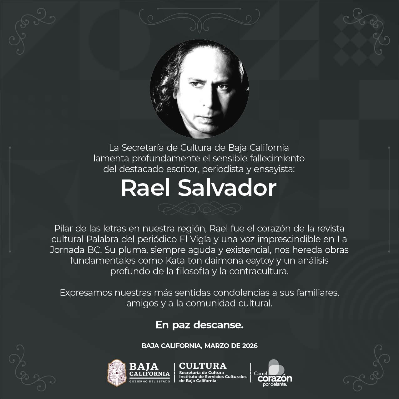 “La Secretaría de Cultura de Baja California lamenta profundamente el sensible fallecimiento del destacado escritor, periodista y ensayista: Rael Salvador. Pilar de las letras en nuestra región, Rael fue el corazón de la revista cultural Palabra del periódico El Vigía y una voz imprescindible en La Jornada BC. Su pluma, siempre aguda y existencial, nos hereda obras fundamentales como ‘Kata ton daimona eaytoy’ y un análisis profundo de la filosofía y la contracultura. Expresamos nuestras más sentidas condolencias a sus familiares, amigos y a la comunidad cultural. En paz descanse”.