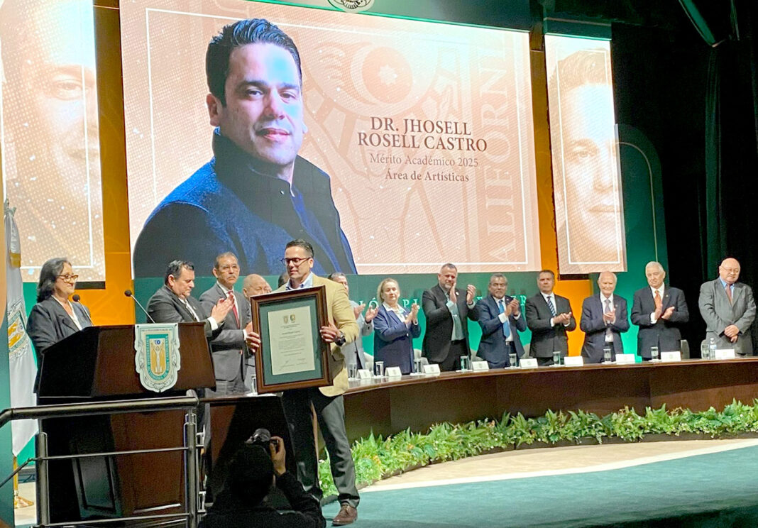 El artista plástico y profesor investigador de la Facultad de Artes de la Universidad Autónoma de Baja California (UABC) Campus Tijuana, Jhosell Rosell Castro, recibió el Premio al Mérito Académico 2025, debido a que “su trayectoria ha impactado de manera significativa en la formación de estudiantes, la investigación, la producción artística y el fortalecimiento de los programas educativos”.