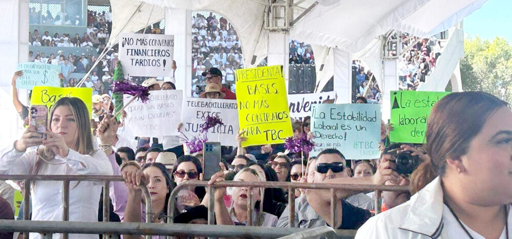 “presidenta, no más bases, no más contratos para Telebachillerato Comunitario, “La estabilidad laboral es un derecho” reclamarón, “Telebachillerato exige justicia”, se leía en las pancartas que levantaron en medio del acto público de la mandataria.