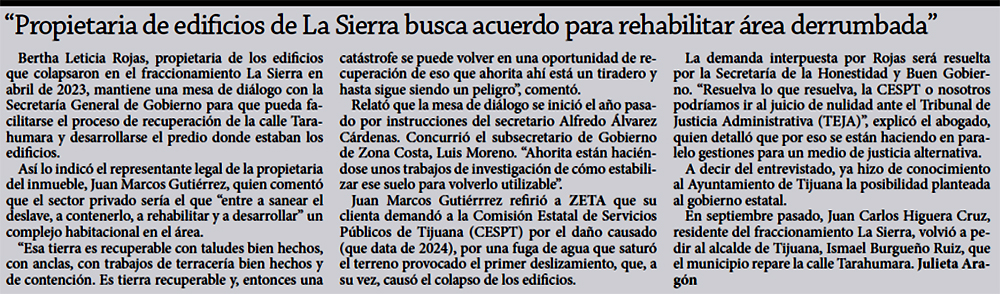 La jueza Griselda Rábago Lara vinculó a proceso a Raúl Melo Cabañas, representante legal de la empresa Comercializadora Edifícate S.A. de C.V., conocida como Grupo Melo, y a Rocío Llarena Páez, perito de la construcción del fraccionamiento Valle del Pedregal, por presuntamente haber cometido daño en propiedad ajena culposo en el deslizamiento de tierra de Lomas del Rubí, Tijuana. (Se presume inocente mientras no se declare su responsabilidad por la autoridad judicial. Art.13, CNPP)