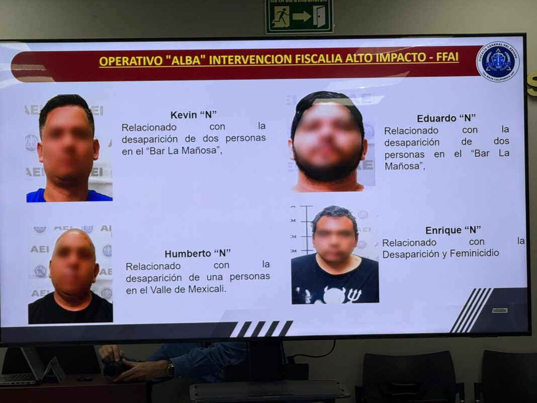 Por desaparición forzada de dos jóvenes que salieron de las instalaciones del bar La Mañosa, por otro caso ocurrido en el valle de Mexicali; y un caso más de presunto feminicidio, fue por lo que los cuatro agentes de la Policía Municipal de Mexicali, fueron detenidos por elementos de la Fiscalía General del Estado (FGE) durante le pasado fin de semana.