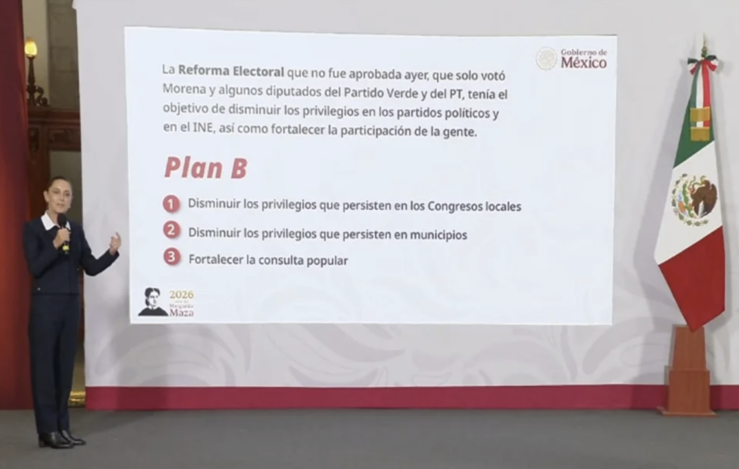La presidenta Claudia Sheinbaum Pardo anunció el 12 de marzo de 2026, desde Palacio Nacional, el denominado Plan B de la reforma electoral, cuyo eje central es reducir el gasto en los Congresos locales y en las regidurías de los municipios del país, tras el rechazo de su iniciativa de reforma constitucional en la Cámara de Diputados. La mandataria nacional adelantó que la propuesta se enviaría al Congreso de la Unión el lunes 16 del mismo mes y año.