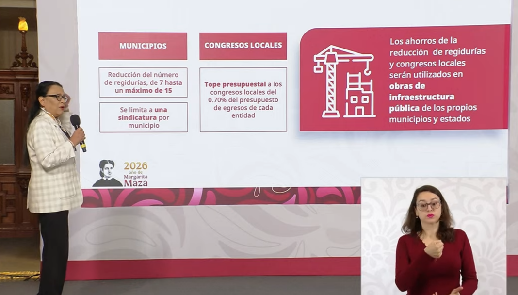 A nivel local, la iniciativa establece un límite presupuestal a los congresos estatales equivalente al 0.70 por ciento del presupuesto de cada entidad, con la condición de que quienes superen ese techo reduzcan su gasto y quienes estén por debajo no puedan incrementarlo en términos reales. Para los municipios, se plantea reducir el número de regidores a un rango de entre siete y 15, según el tamaño de la población, y limitar a una sindicatura por ayuntamiento. Los recursos derivados de esos ajustes deberán destinarse a obras de infraestructura pública. La propuesta contempla también una reducción progresiva del gasto en el Senado de la República de hasta el 15 por ciento.