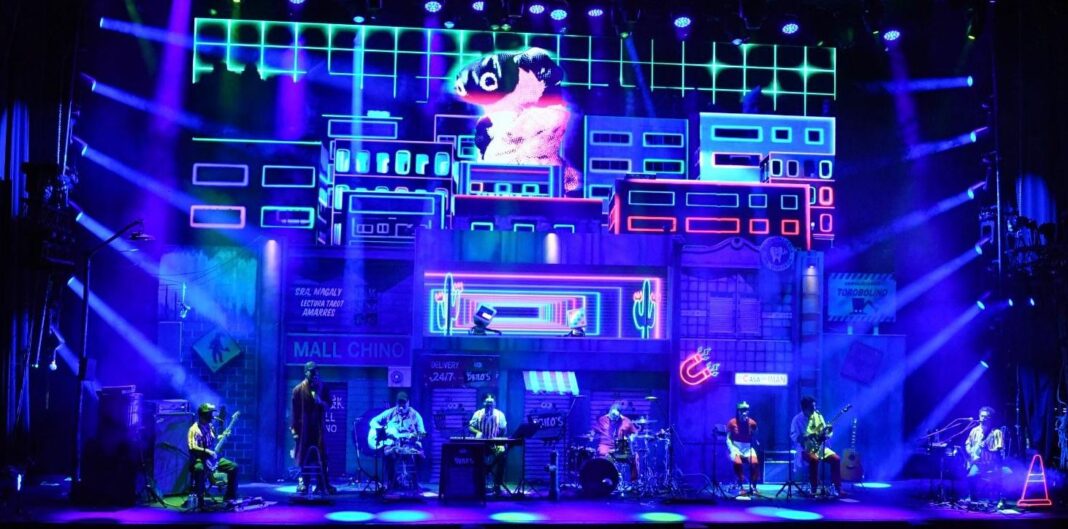 El espectáculo continuó con la llegada de los Hermanos Computadores de Paine, quienes interpretaron “Mr. Guantecillo” en una tarima cargada de luces y colores vibrantes.