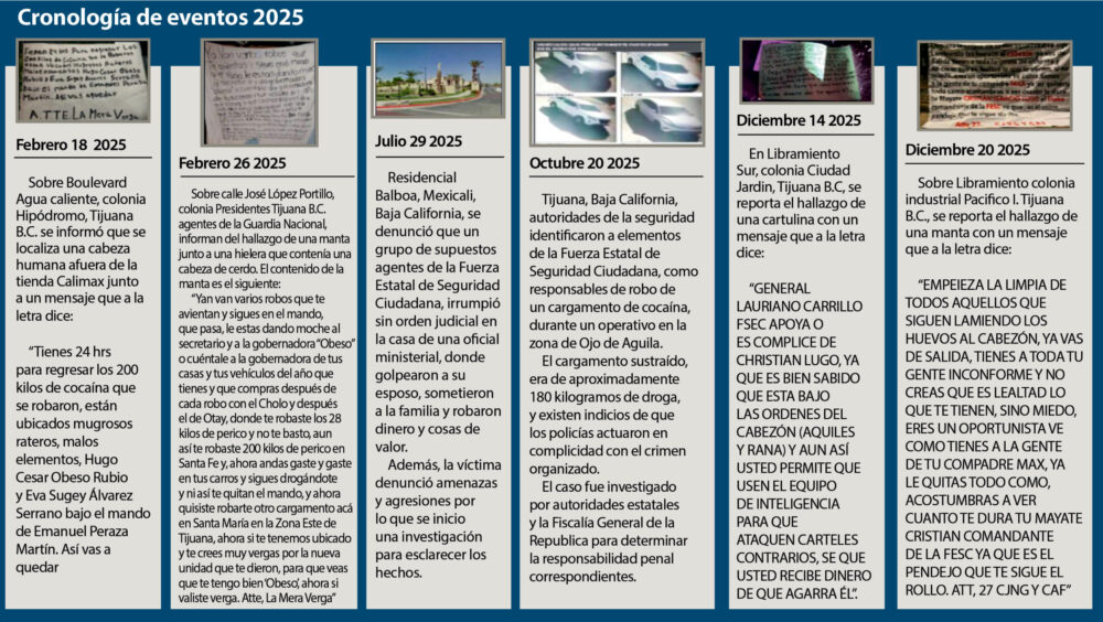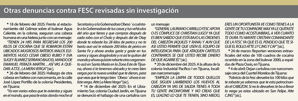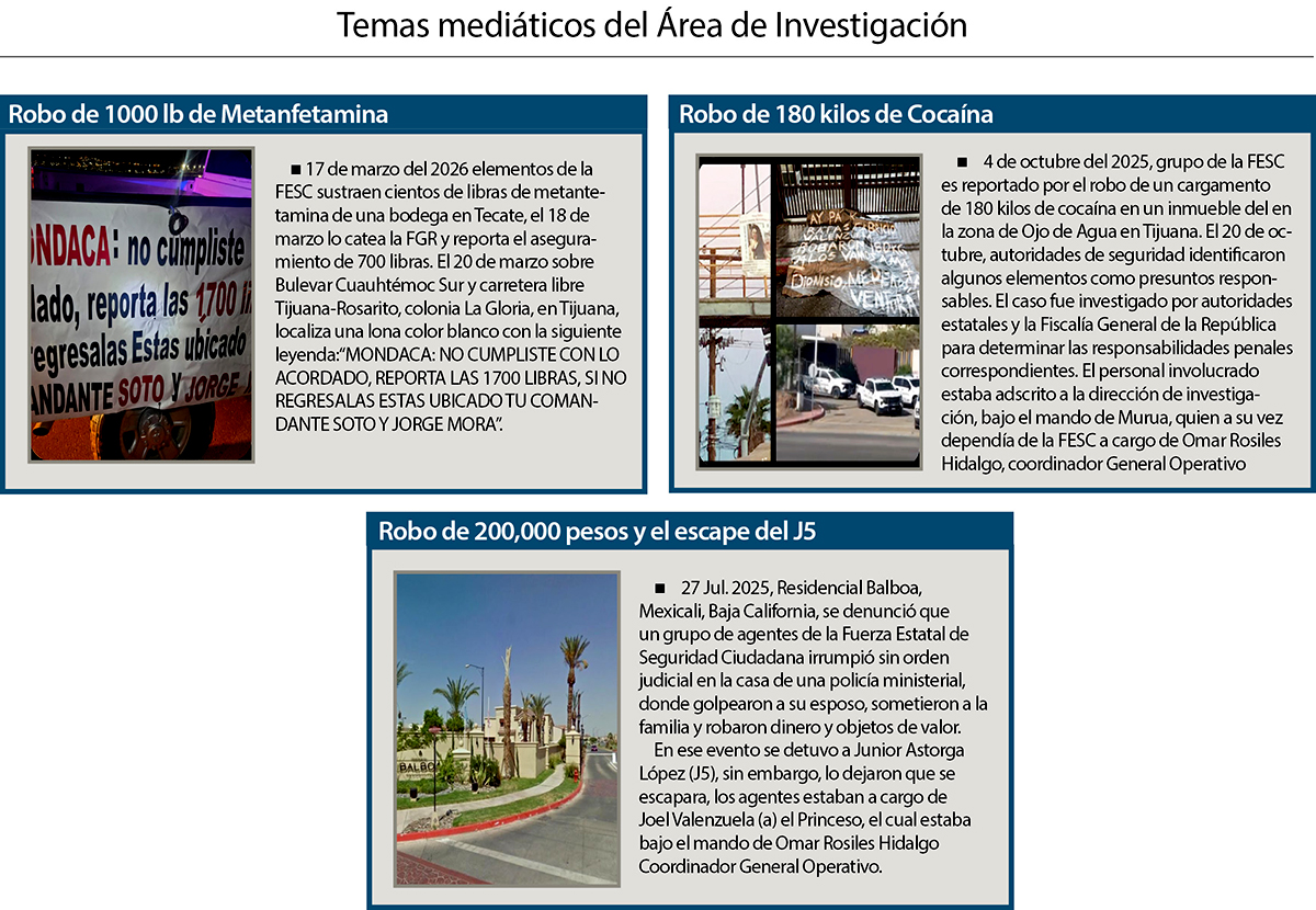 La otra crisis pública de la FESC vino tras el robo de un cargamento de 180 kilos de cocaína en un inmueble del en la zona de Ojo de Agua en Tijuana, la mañana del 4 de octubre del 2025, cometido con apoyo de una célula del cártel Arellano y usando tres autos de la corporación, un Kia y un pick up blanco. El martes 14 de octubre, apareció colgada una manta -hecha en imprenta- reclamando el robo y acusando a los agentes específicos del área de investigación e inteligencia. En el mismo operativo los FESC dejaron ir al criminal del CAF identificado sólo como “el J5”.