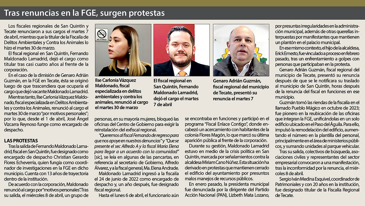 Adicionalmente en Mexicali, a través de una carta anónima esta semana, elementos de la FESC solicitaron a la gobernadora Marina del Pilar Ávila y al general Laureano Carillo, “por favor, hagan algo” respecto a Camacho Marrufo, recién regresado de una suspensión por extorsionar y de Yánez /Lláñez, porque están acosando a los agentes en Mexicali, pidiéndoles dinero mientras les prohíben patrullar el valle cachanilla.
