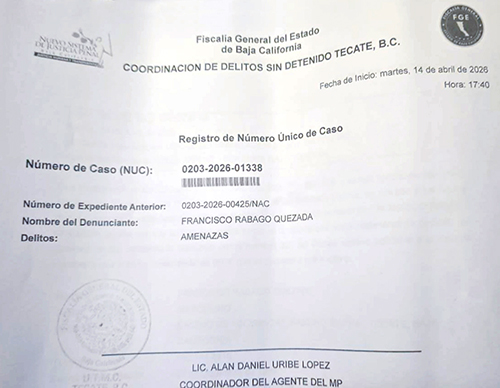 Francisco Rábago, director del medio de comunicación digital Códice Periódico, dio a conocer el martes 14 de abril de 2026 que interpuso una denuncia por el delito de amenazas ante la Fiscalía General del Estado, contra el hermano del regidor en Tecate del Partido Verde Ecologista de México, Isaac Contreras, después de que el identificado como Antonio lo abordara mientras caminaba por el parque Miguel Hidalgo, ubicado en la Zona Centro del municipio de Tecate: