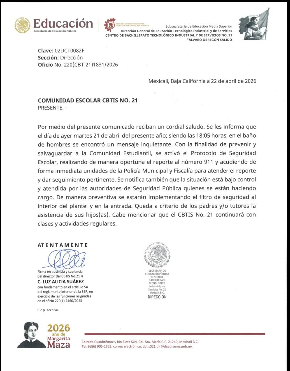 Esta amenaza se suma a las ocurridas también en la preparatoria CETIS 18 y CBTIS 140, ambas en el municipio de Mexicali en días recientes.
