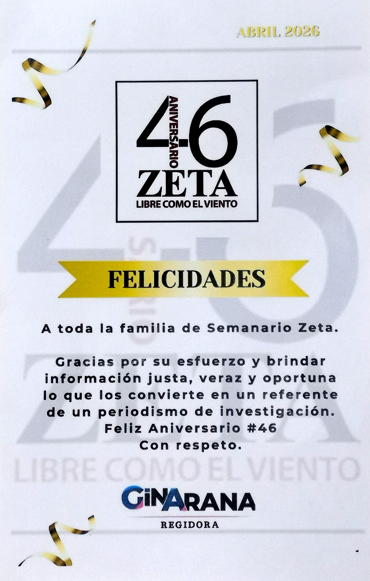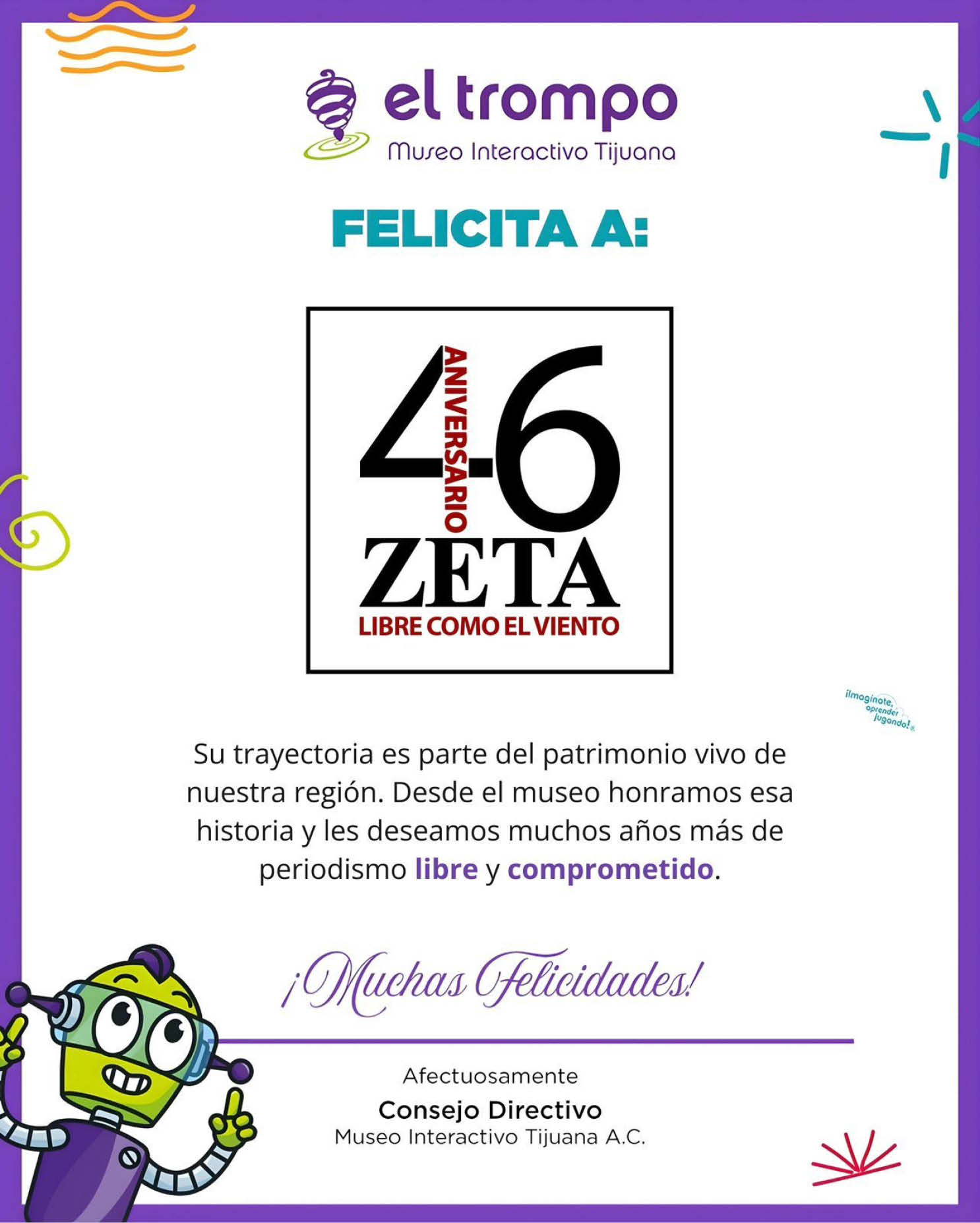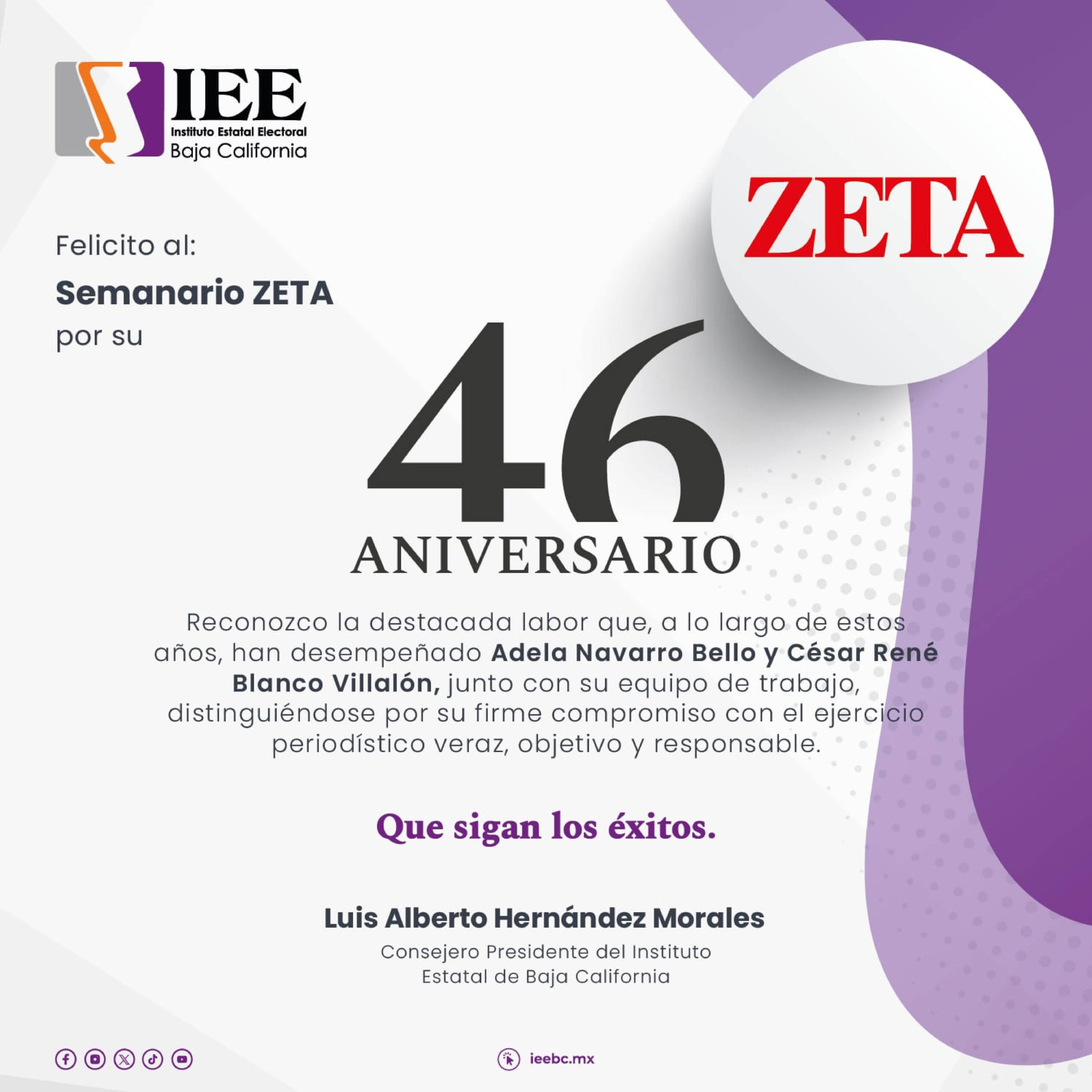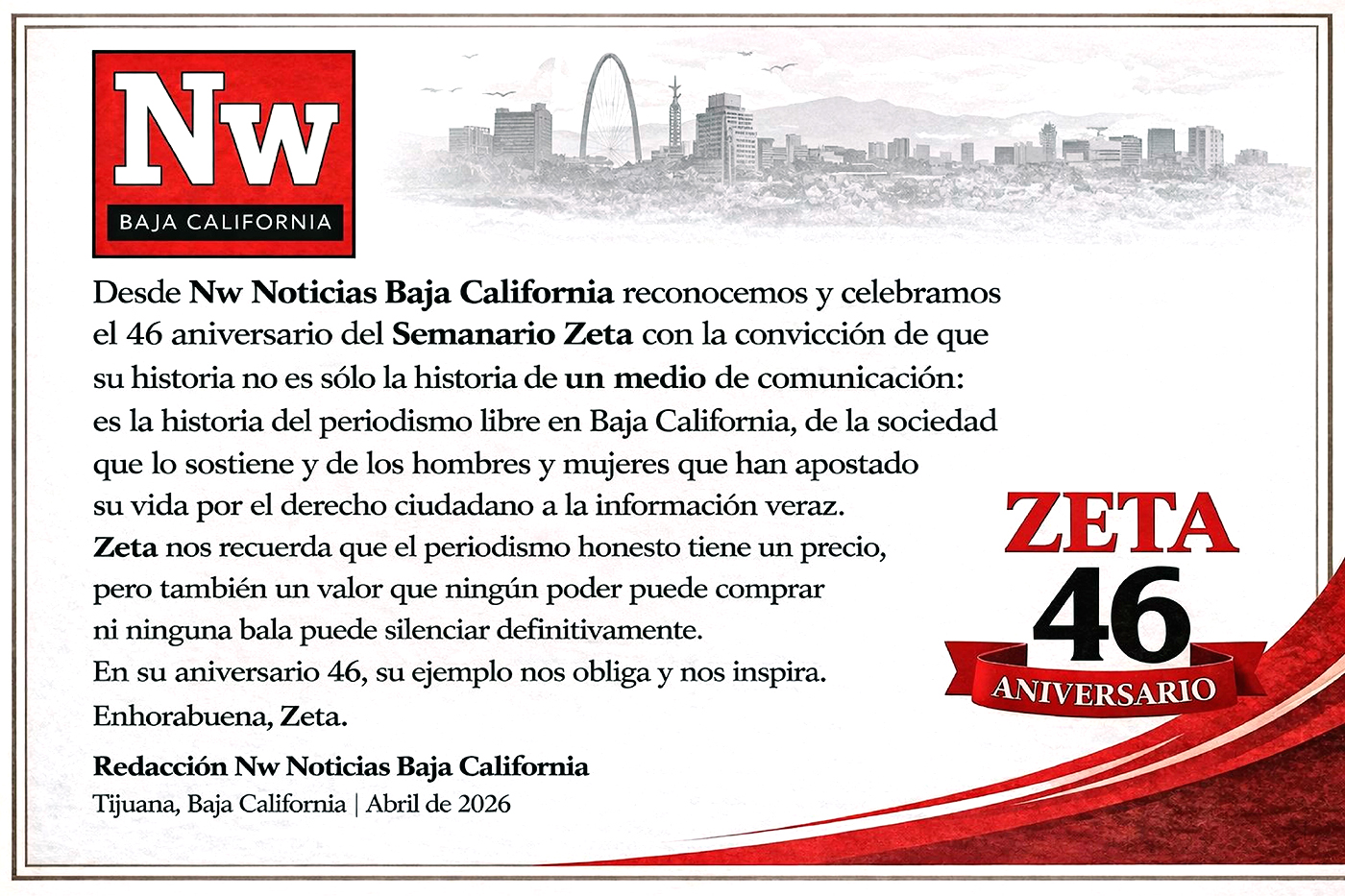 Publicidad Cartaz Felicitaciones para ZETA Por Redacción Zeta abril 20, 2026 FacebookWhatsAppTwitterTelegram Publicidad Publicidad Comparte esto: Comparte en Facebook (Se abre en una ventana nueva) Facebook Share on X (Se abre en una ventana nueva) X Share on Telegram (Se abre en una ventana nueva) Telegram Share on WhatsApp (Se abre en una ventana nueva) WhatsApp TEMASAniversariofelicitacionesZETA Previous articleRoccoNext articleVanessa Zamora prepara nuevo álbum FacebookWhatsAppTwitterTelegram - Publicidad - Autor(a) Redacción ZetaRedacción de www.zetatijuana.com - Publicidad - Puede interesarte Leyzaola se adhiere al PVEM; espacios en Morena “están muy peleados”, dice abril 20, 2026 “Hay que matar a quien tengan que matar”: Imputan a Selina por homicidio y sustracción de su hijo abril 20, 2026 Para sostener el tratamiento de más de mil niños, CRIT BC lanza Subasta Morada abril 20, 2026 Publican Protocolo Nacional para Activación de Alerta de Búsqueda abril 20, 2026 LEAVE A REPLY Cancel reply Comment: Please enter your comment! Name:* Please enter your name here Email:* You have entered an incorrect email address! Please enter your email address here Website: Save my name, email, and website in this browser for the next time I comment. Δ -Publicidad - - Notas recientes - Denuncian fraude de agencia “BC Baja Motors” en Tijuana abril 20, 2026 Los himnos abril 20, 2026 Leyzaola se adhiere al PVEM; espacios en Morena “están muy peleados”, dice abril 20, 2026 EE.UU. cerca a Archivaldo abril 20, 2026 De mundialitos, “mejoralitos” y Zoé Robledo abril 20, 2026 Destacadas Sheinbaum pide a EU aclarar operativo en Chihuahua donde murieron dos agentes de la Embajada abril 20, 2026 Accidente en carretera Mexicali-Tijuana deja una mujer sin vida y dos heridos graves abril 20, 2026 EU restringe visas a 75 personas vinculadas a familiares y socios del Cártel de Sinaloa abril 20, 2026 Abogados de Ensenada proponen sede para la especialización jurídica abril 19, 2026 Fiscalía “no avanza” en caso de fraude inmobiliario de más de 21 mdp, denuncian afectados abril 19, 2026 -Publicidad - -Publicidad -