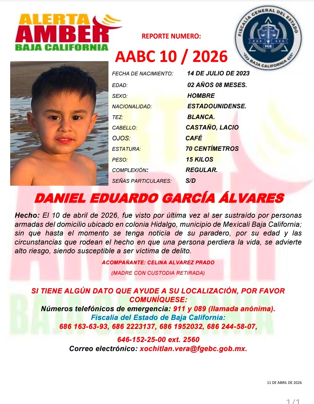La Fiscalía General del Estado emitió una Alerta Amber para localizar a un menor de dos años que fue sustraído durante una reunión en la colonia Hidalgo, en Mexicali, la noche del viernes 10 de abril.