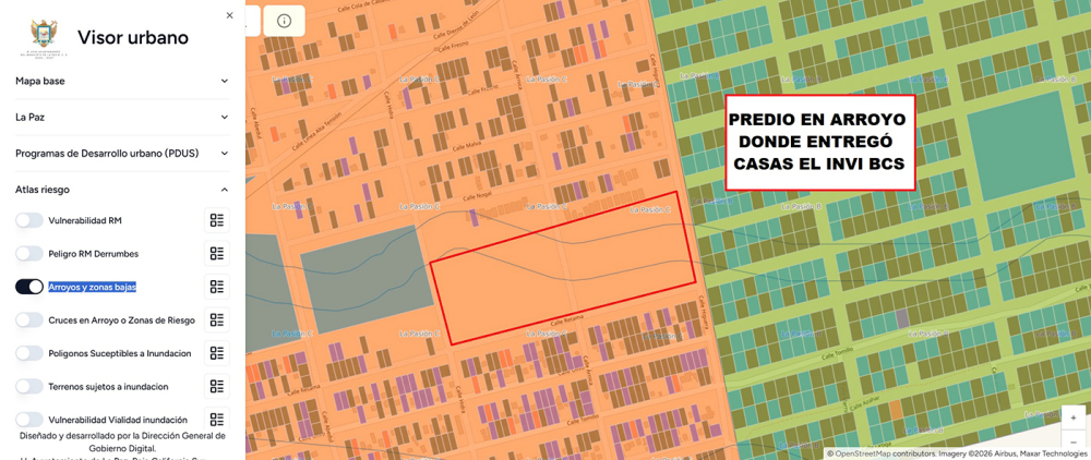 El Visor Urbano, herramienta del Ayuntamiento de La Paz tiene muy claro el panorama; en la sección del Atlas de Riesgo, en el apartado de “Arroyos y Zonas Bajas”, viene marcado el predio donde entregaron las viviendas del INVI con el cauce natural de un arroyo, en el cual hay dos escenarios:
