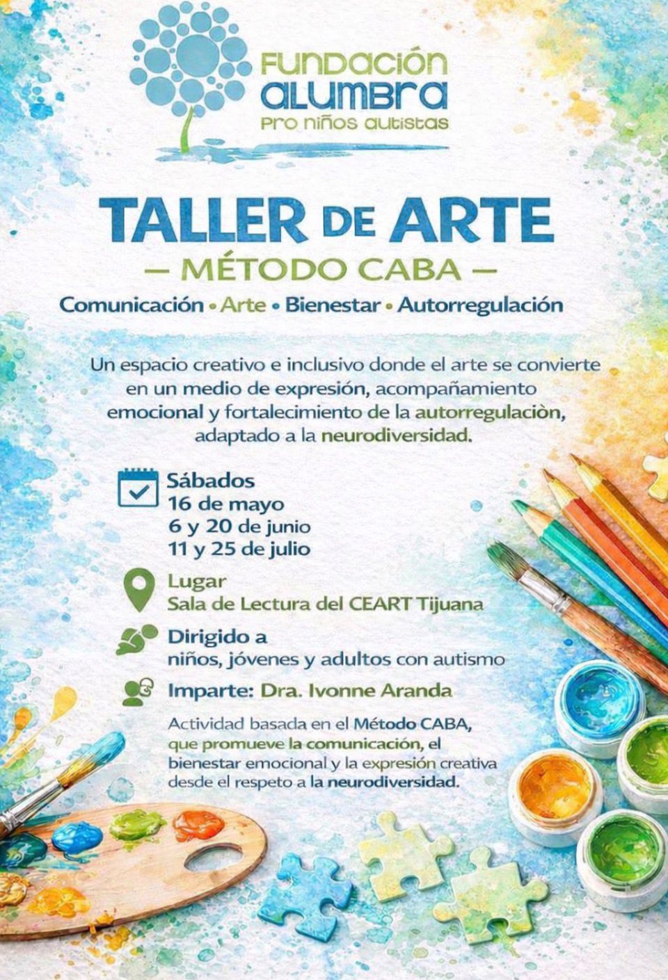 Con el propósito de seguir fortaleciendo la expresión, el bienestar emocional y la autorregulación a través del arte, la Fundación Alumbra Pro Niños Autistas de Baja California, en coordinación con la doctora y artista plástico Ivonne Aranda, dará continuidad al tercer módulo del Taller de Arte Método CABA: Comunicación, Arte, Bienestar y Autorregulación, una propuesta creativa e inclusiva dirigida a niños, jóvenes y adultos con autismo.