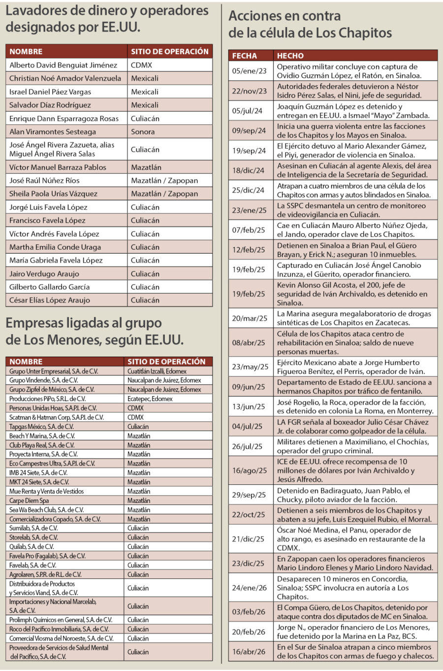 Durante los últimos 14 meses autoridades de los Estados Unidos pusieron el “foco” en las redes del blanqueo de capitales de la organización criminal de los Chapitos o los Menores, facción en conflicto del Cártel de Sinaloa, designando a por lo menos 18 de sus integrantes como operadores tanto del lavado de dinero como de facilitar el tráfico y producción ilícita de drogas entre ellas fentanilo. También 29 empresas fueron señaladas de ser utilizadas para los aviesos intereses del clan delictivo en ciudades de los estados de México, Baja California, Sinaloa, Jalisco y Sonora.