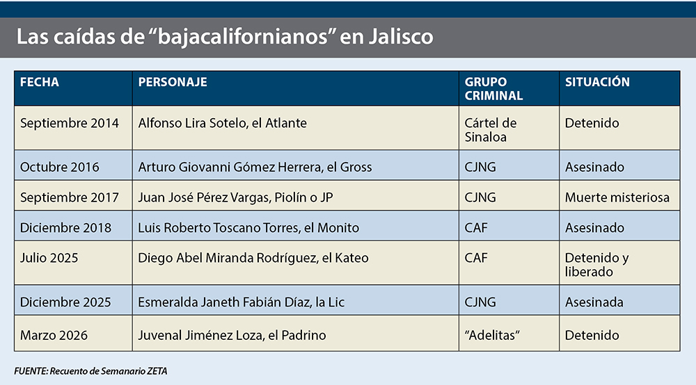 Entre 2025 y 2026 se conoció de las detenciones de Juvenal Jiménez Loza, el Padrino, uno de los dueños del “Bar Adelitas” en Tijuana, y de Diego Abel Miranda Rodríguez, el Kateo, que se encuentra en la línea de los jefes del Cártel Arellano Félix, quien fue liberado por tecnicismos legales que apestan a corrupción. Entre ambas capturas, fue ejecutada Esmeralda Janeth Fabián Díaz, alias la Lic o la Mamá de la Sánchez, alineada con el CJNG.