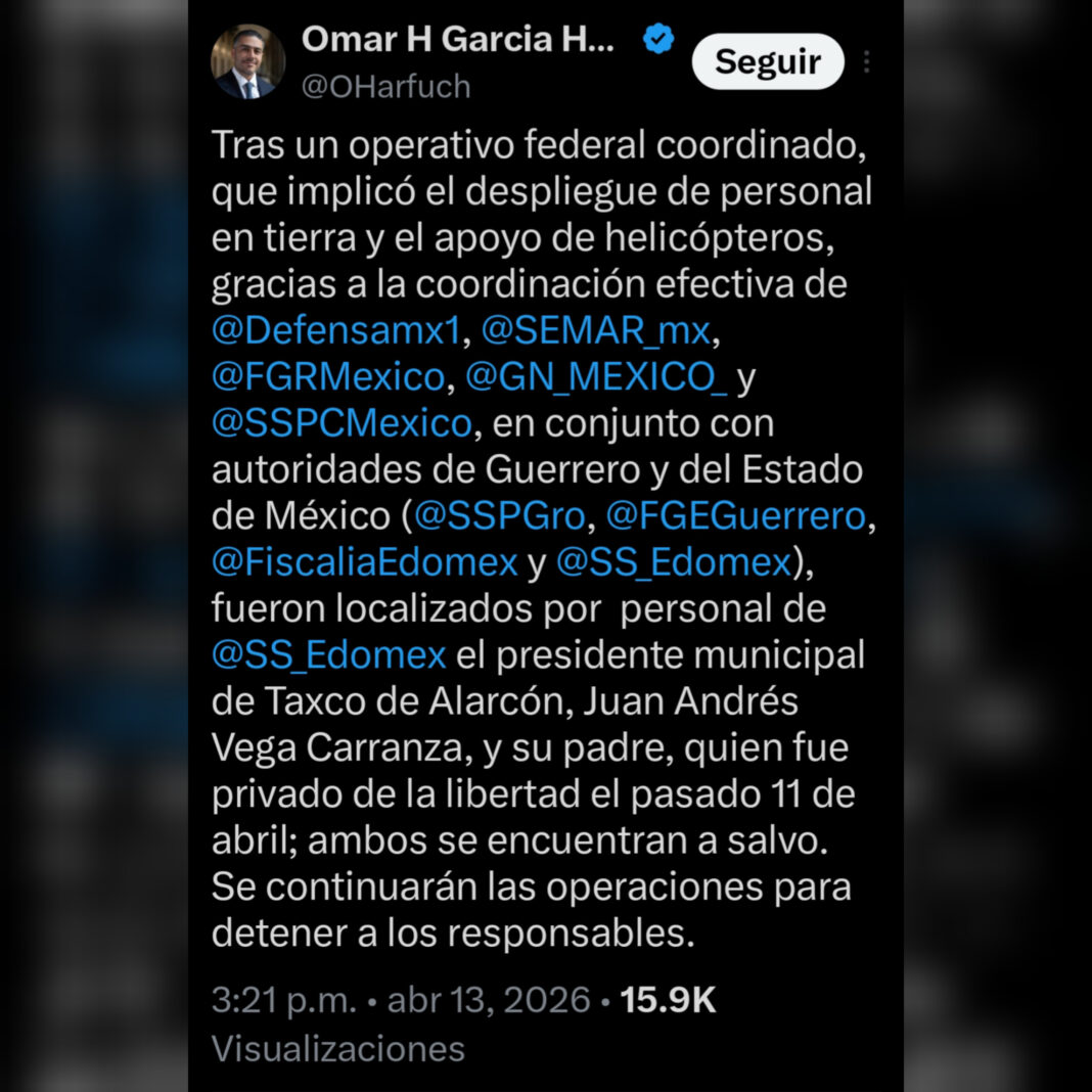 Un operativo federal coordinado con despliegue terrestre y apoyo de helicópteros culminó el 13 de abril de 2026 con la localización con vida del presidente municipal de Taxco de Alarcón, Guerrero, Juan Andrés Vega Carranza, y de su padre, el médico Juan Vega Arredondo, director del Hospital IMSS-Bienestar “Adolfo Prieto” de ese municipio, quien había sido privado de la libertad el 11 de abril. La confirmación fue emitida por Omar Hamid García Harfuch, titular de la Secretaría de Seguridad y Protección Ciudadana (SSPC) Federal.