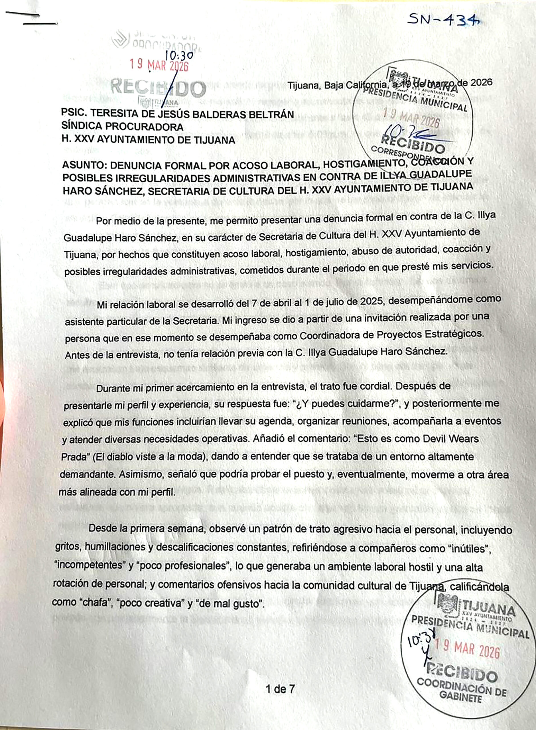 El viernes 17 de abril de 2026, una extrabajadora de la Secretaría de Cultura de Tijuana, que pidió el anonimato, entregó a ZETA la denuncia íntegra (siete cuartillas de relatoría de hechos) que hizo contra Illya Guadalupe Haro Sánchez, secretaria de Cultura de la ciudad fronteriza, presentada ante Teresita de Jesús Balderas Beltrán, Síndica Procuradora del XXV Ayuntamiento de Tijuana, con fecha y sellos de recibido por Presidencia Municipal y la propia Sindicatura del 19 de marzo de 2026.