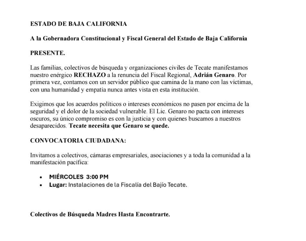 Advirtiendo que este miércoles en punto de las 3:00 de la tarde se llevará a cabo al exterior de las actuales instalaciones de la fiscalía regional, ubicadas en el Paso del Águila, una manifestación para solicitar la cancelación del oficio de traslado de Genaro Guzmán a San Quintín, lo que habría motivado su renuncia.