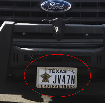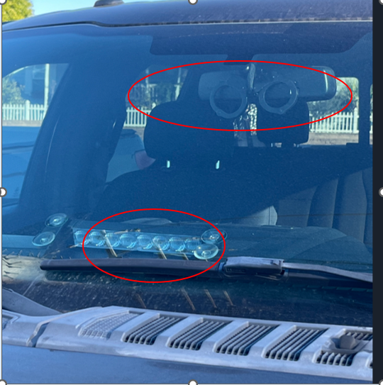 La unidad contaba con diversos elementos que simulaban pertenecer a una corporación oficial, como una calcomanía de la Patrulla Fronteriza en el parabrisas, antenas de radio no funcionales en el techo, una barra de luces en el tablero y un marco de placa con la leyenda “Ferderal Truck” [sic]. Además, tenía esposas colgando del espejo retrovisor.